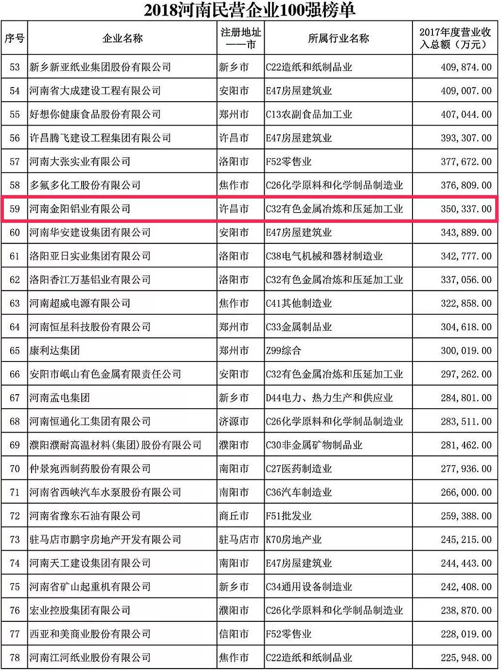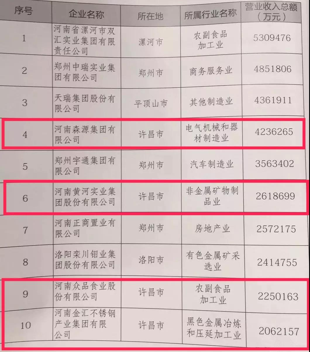 2018“河南民营企业100强”名单,前10名就有咱长葛的4家!Bsports体育注册·(必一运动)官方网站集团、黄河集团、众品食业、金汇集团和金阳铝业分别凭借2017年423.6亿元、261.8亿元、225亿元、206.2亿元和35亿元的营业收入入围该榜单,分列第4位、第6位、第9位、第10位和第59位。