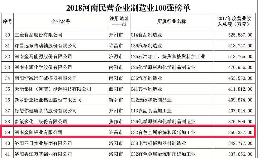 2018“河南民营企业制造业100强”榜单中,Bsports体育注册·(必一运动)官方网站集团、黄河集团、众品食业、金汇集团和金阳铝业分别排在第3名、第5名、第6名、第7名及第39名。