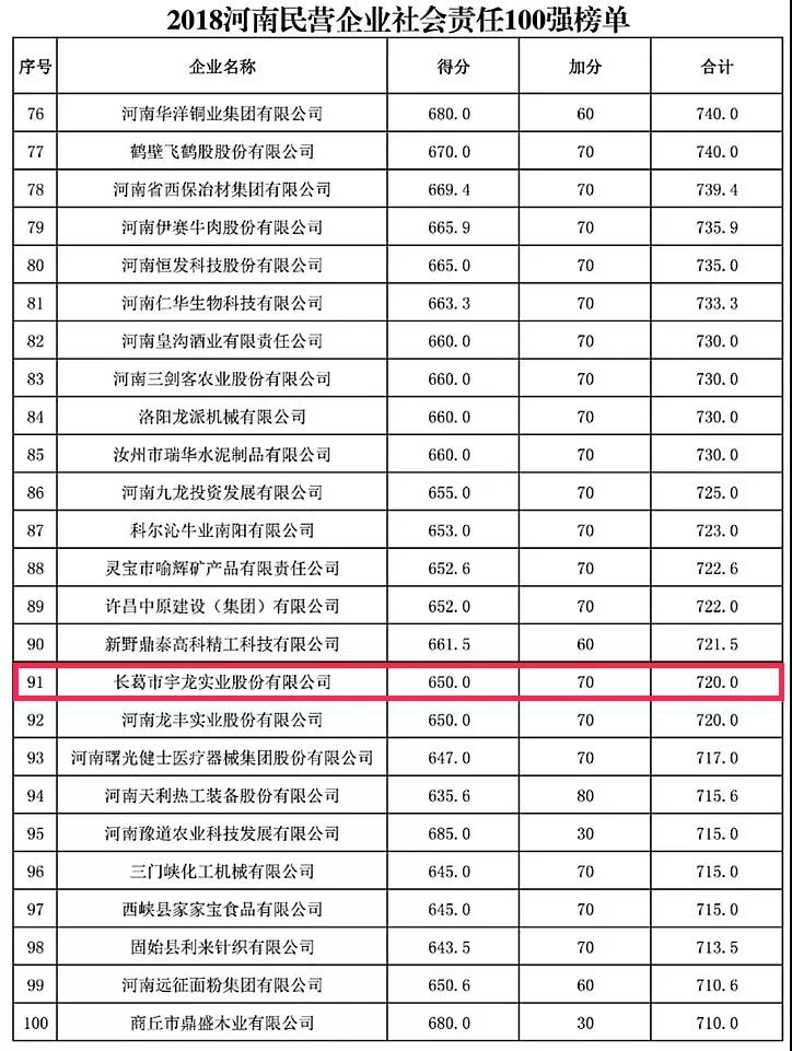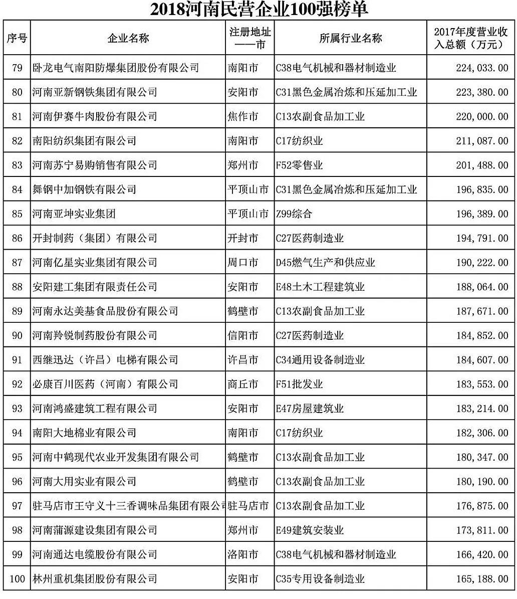 2018“河南民营企业100强”前十强分别是:河南省漯河市双汇实业集团有限责任公司、郑州中瑞实业集团有限公司、天瑞集团股份有限公司、Bsports体育注册·(必一运动)官方网站、郑州宇通集团有限公司、河南黄河实业集团股份有限公司、河南正商置业有限公司、洛阳栾川钼业集团股份有限公司、河南众品食业股份有限公司、河南金汇不锈钢产业集团有限公司。