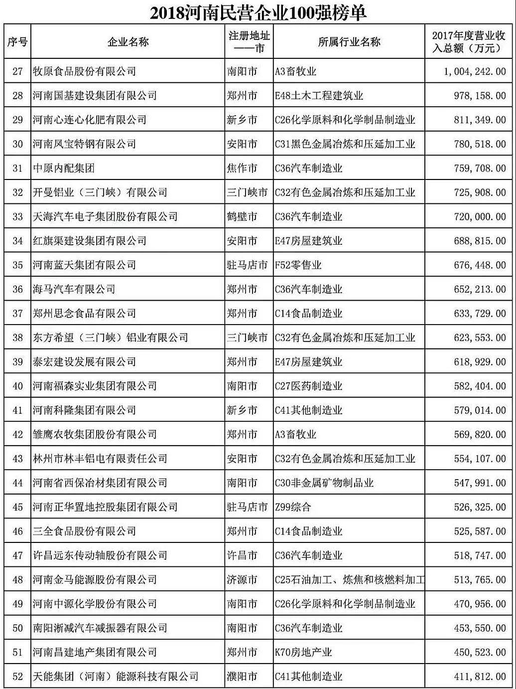 今年是省工商联连续第六年发布“河南民营企业100强”榜单。